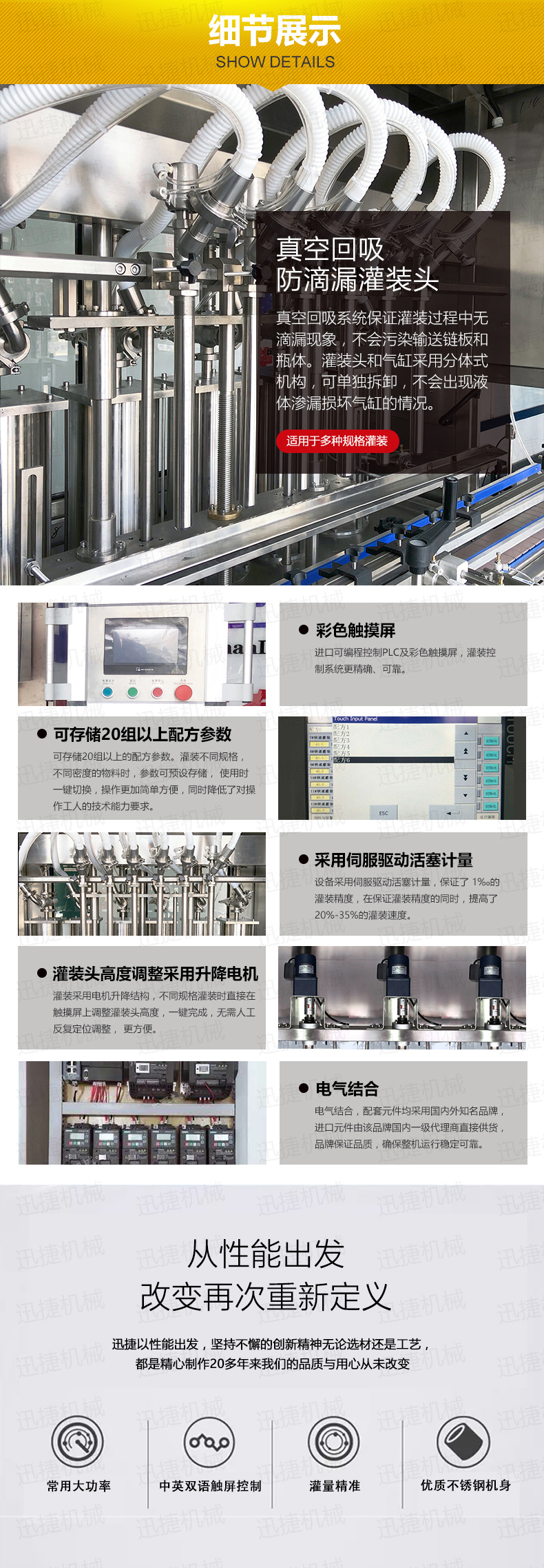 動力結構部分:單頭單泵單變頻,每個灌裝頭自帶動力,最大程度避免因為管路分流不均造成的灌裝誤差,精度高,速度快(供料快),多段速灌裝,保證灌裝精度的前提下,提高20%的灌裝速度。設
