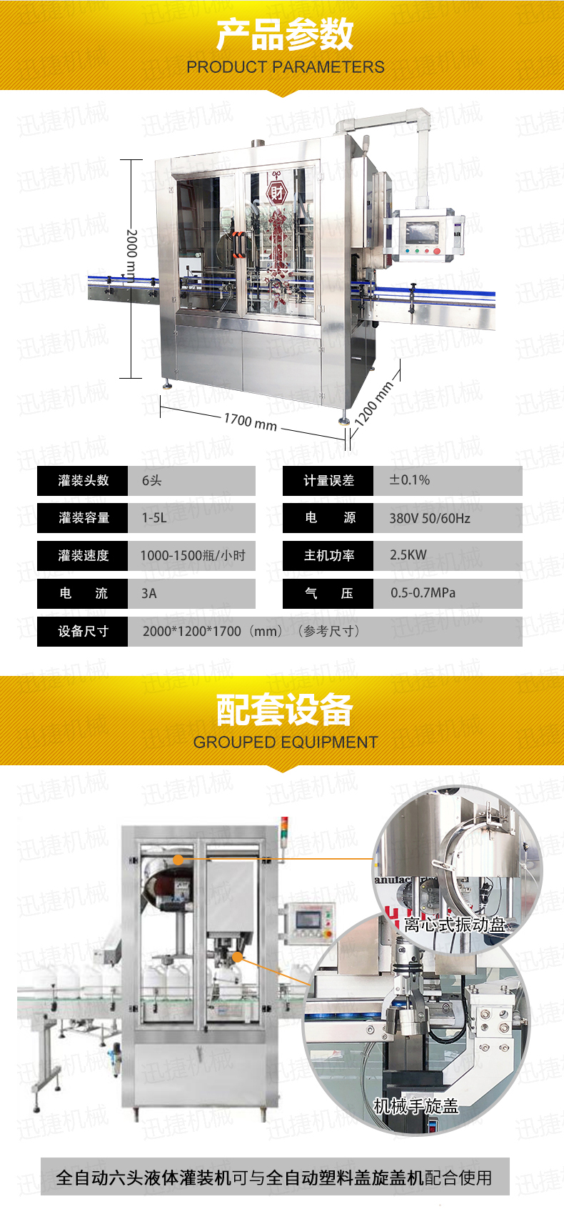 8、采用先進的定量灌裝技術,可以對多種液體及粘稠液體進行定量灌裝和封蓋,是新型的機電一體化灌裝設備。