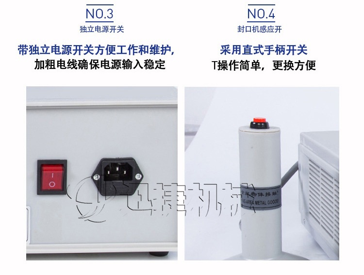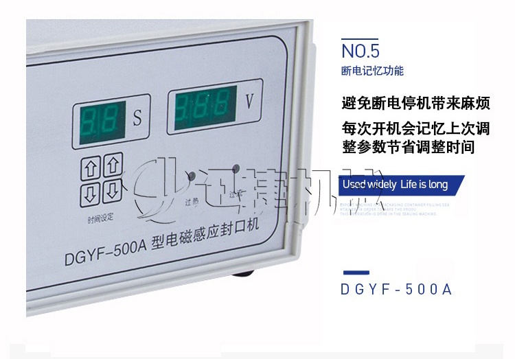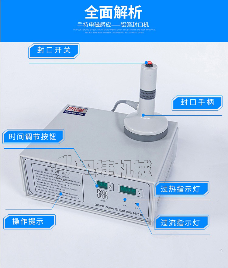 小型鋁箔封口機為鋁箔封口設計精心制造,小型鋁箔封口機為中高檔型產品,功率可調,數字顯示,風冷連續式工作,高效高速,可移動式,方便靈活使用。小型鋁箔封口機是利用電磁感應的原理,將瓶口上的鋁箔片瞬間產生高熱,然后熔合在瓶口上,使達到封口的功能。電磁感應所封的鋁箔能有效的防止瓶裝物品溢出、受潮和霉變,延長所封物品的保存期,起到延長物品保存周期的目的。封口容器的材質可以是聚乙(PE)、聚丙烯(PP)、聚酯(PET)、聚苯乙烯(PS)、ABS以及玻璃等,適用于制藥、食品、化工、化妝品等行業中塑料瓶(材料為PE、PP、PS、PVC、PET)和玻璃瓶的封口。